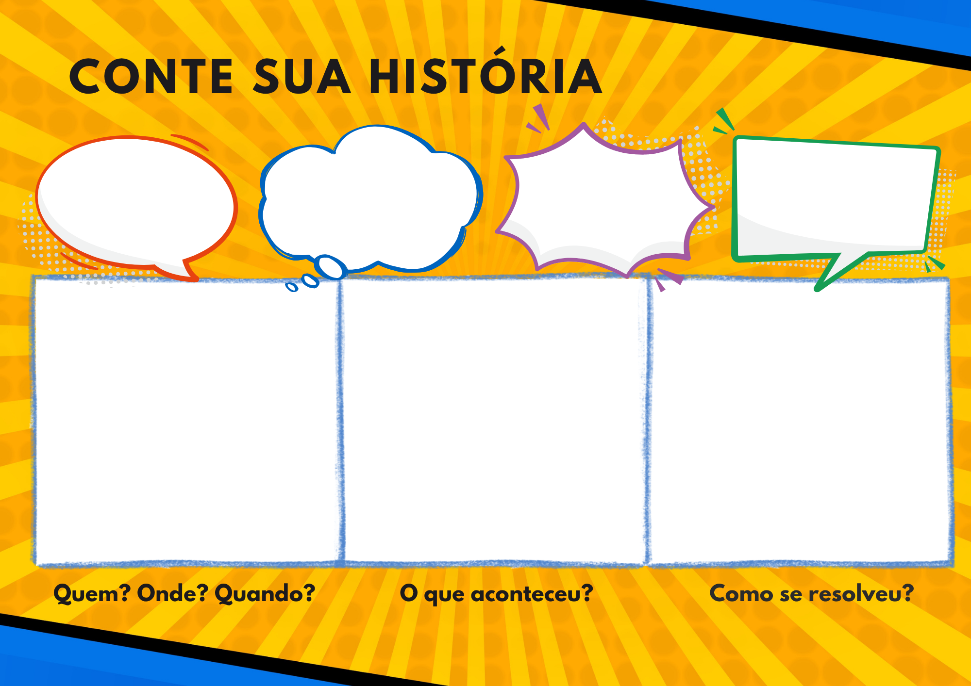 • Quadrinhos da Minha História: a criança desenha ou escreve quem são os personagens, o que aconteceu e como tudo terminou. O adulto entende, de forma simples, o olhar dela sobre suas próprias experiências.