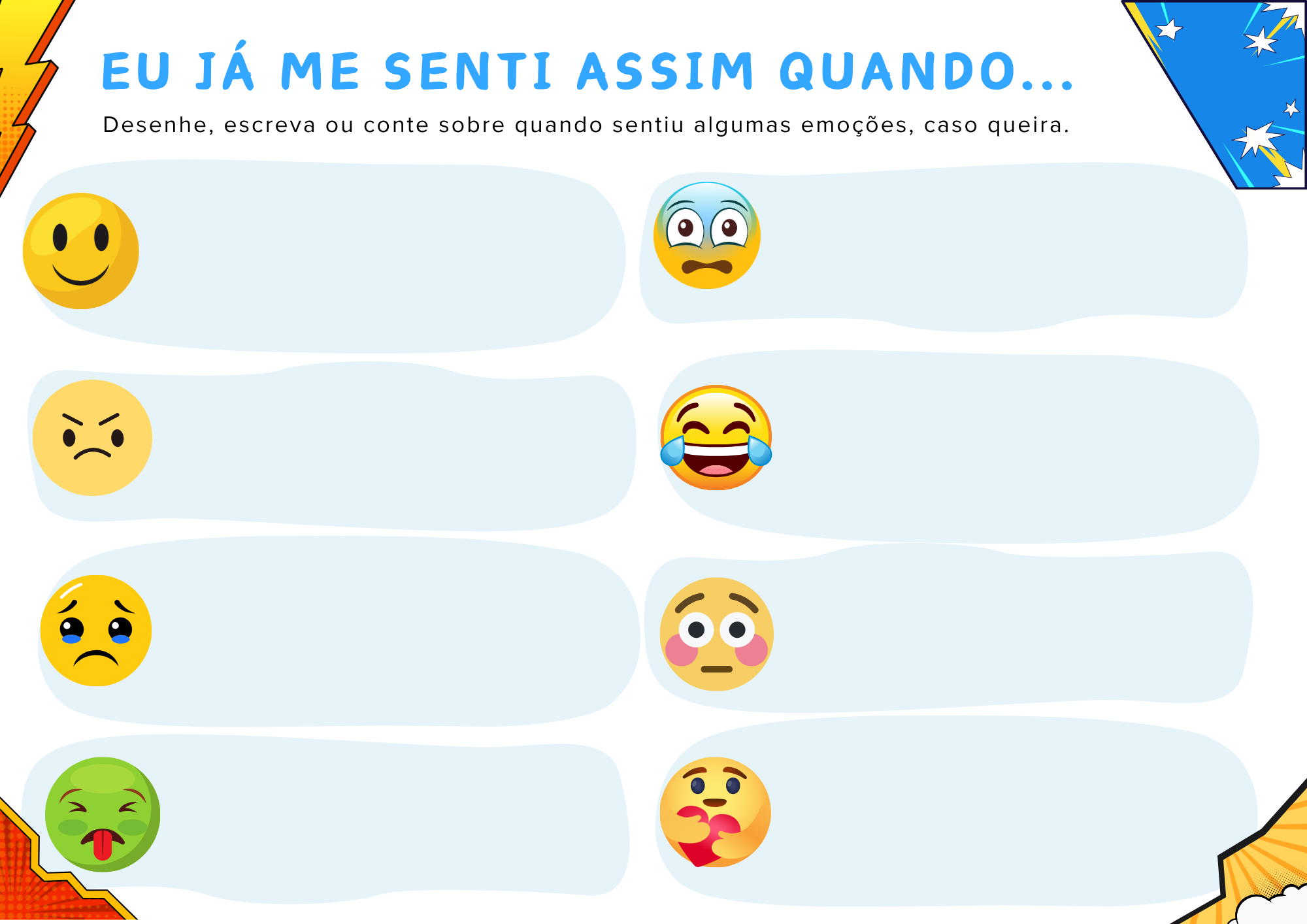 • Eu já me senti assim quando...: espaço para registrar emoções vividas em diferentes situações. A criança aprende a reconhecer seus sentimentos e o adulto consegue identificar o que pode estar acontecendo em sua vida.